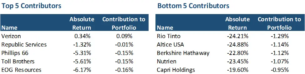 Up until mid-June the Concentrated Value Fund was flat for the quarter with an even mix of stocks up and down in the quarter-to-date period. In the ensuing two weeks, the portfolio dropped 10% as all assets seemingly fell in unison. As you can see in the table below, the only stock in the portfolio that finished the quarter in positive territory was Verizon, which managed to eke out a 0.3% return. Even the steadfast and well managed Berkshire Hathaway landed on our list of top detractors in the portfolio this quarter.