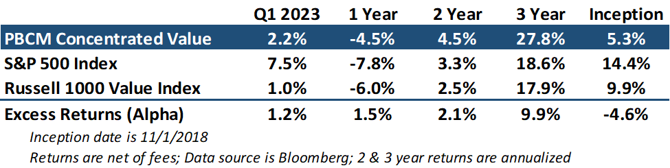 During the first quarter, the Concentrated Value portfolio outperformed our benchmark – the Russell 1000 Value Index – by 123 basis points in the first quarter of 2023. However, we did trail the S&P 500 Index which benefited from the strong gains in the mega-cap tech FANG+ stocks that we described above. Over the one, two, and three year periods the Concentrated Value portfolio has outpaced the Russell 1000 Value Index and S&P 500.