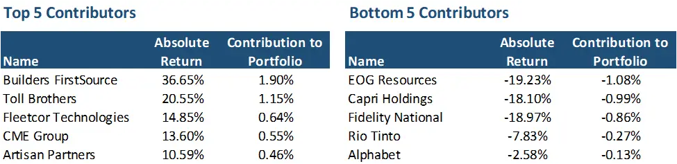 The Concentrated Value portfolio benefited from strength in the Consumer Discretionary, Healthcare, and Industrial sectors. Energy stocks that have been consistent sources of outperformance for the past two years, detracted from our performance in the first quarter. Below is a table with our top five and bottom five contributors to our return for the fourth quarter.
