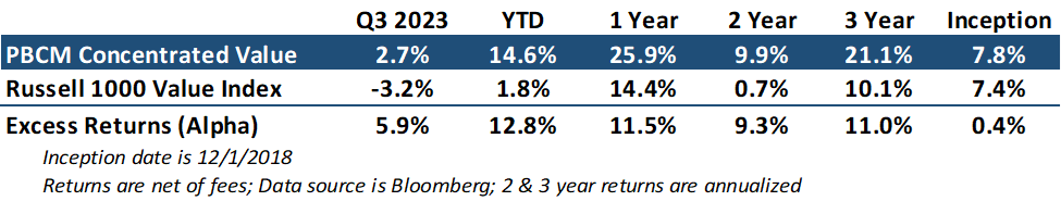 The Concentrated Value portfolio returned a positive 2.7% in the third quarter, outperforming the Russell 1000 Value Index by 589 basis points, or 5.89%. This strong relative performance added to the portfolio’s solid results in the first half of the year, increasing its year-to-date alpha relative to its benchmark to 1,281 basis points, or 12.81%.