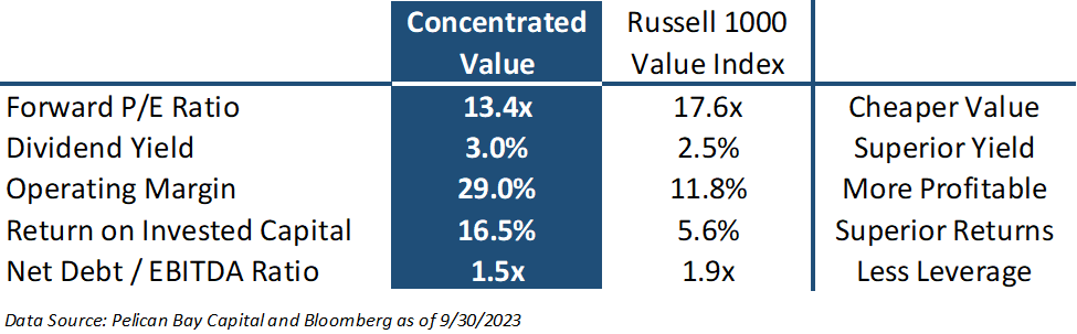 As the table below shows, the portfolio continues to be defined by these characteristics. Our companies have higher profit margins, higher returns on invested capital, higher dividend yields, and less financial leverage. Yet they trade for an average price-to-earnings (PE) multiple of just 13.4x forward earnings, much less than the 17.6x forward multiple of the Russell 1000 Value Index.