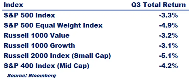 In general, stocks saw modest declines in the third quarter, reversing some of the large gains in the second quarter. Returns for the major stock indices were remarkably consistent with declines between -3.1% and -5.1% (see table below). This tight cluster of returns across both market cap classifications and value/growth factors was in sharp contrast to the first half of 2023, when large-cap growth stocks outperformed other stock indices by a significant margin.