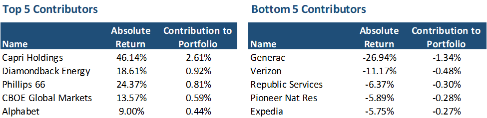 The primary factor driving the portfolio’s positive results in Q3 was the buyout offer made by Tapestry (TPR) for Capri Holdings (CPRI). Under the terms of the merger agreement, Tapestry is paying shareholders $57.00 per share in cash. Prior to the announcement of the offer, shares of CPRI were trading for $35. The stock price jumped 56% to $53 on the day of the announcement. Fortunately, we believed that CPRI was significantly undervalued, and we happened to add to our holdings in the company only days before the merger offer, making it the portfolio’s largest position.
