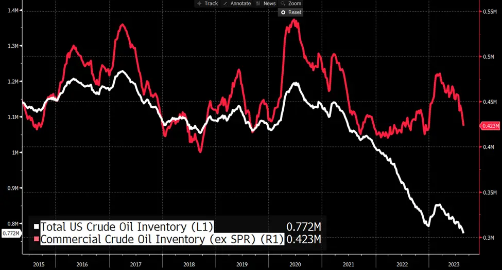 As you can see in the chart below, the more widely followed Commercial Crude Oil Inventory excluding the SPR (red line – right axis) is at levels that are consistent with pre-pandemic range. However, when we observe Total US Oil Inventories that includes oil barrels the SPR (white line – left axis), we see that inventories are down substantially, to levels not seen since 1984. Because the generally aren’t major movements in the SPR inventory, most strategists and investors have historically ignored the Total US Oil Inventory measure in favor of the Commercial Crude Oil Inventory data.