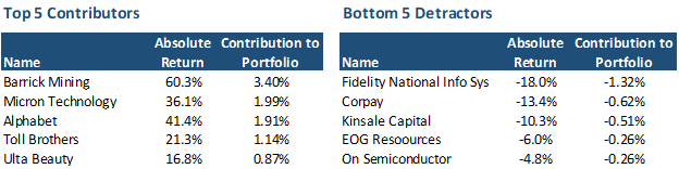 Toll Brothers (TOL) and Ulta Beauty (ULTA) rounded out our list of top 5 contributions to the portfolio’s return this quarter. You can find a list of the portfolio’s top contributors and detractors in the table below.