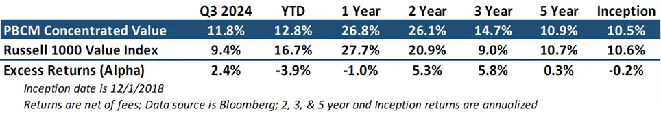 The dominance of the Magnificent Seven stocks waned during the third quarter of 2024, leading to improved market breadth. Value stocks surged, with the Russell 1000 Value Index gaining 9.4%. This environment favored high-quality companies that had underperformed year-to-date. Our Concentrated Value portfolio performed particularly well, rising 11.8% and reversing the underperformance experienced in the second quarter.