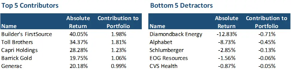 Our strong third-quarter results were driven by our Home Builders and Consumer Discretionary stocks. Companies like Builders FirstSource (BLDR) and Toll Brothers (TOL) rebounded significantly as interest rates declined, offsetting their weak first-half performance. As two of our largest holdings, their outperformance contributed to a 3.8% gain for the overall portfolio. The table below details the top five contributors and detractors to portfolio performance.