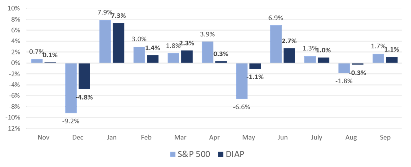 Since inception, the DIAP has proven to be far less volatile than the S&P 500 and has delivered an 9.21% total return with 2.9% monthly standard deviation. By comparison, the S&P 500 Index has increased 10.7% with 5.2% standard deviation. On average the DIAP has participated in 60% of upside return in months when the S&P 500 gained, but only 35% of downside in months with negative returns.