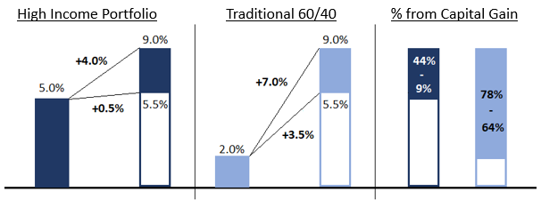 Most importantly, by increasing the portion of investment returns that come from income, the investor can minimize the portion of his return that comes from the inherently volatile capital gains. Thus, the investor can achieve the same long-term return while taking significantly less risk as they rely on a smaller portion of the return coming from capital gains. We detail this in the chart below.