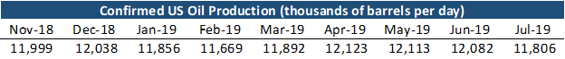 But then a funny thing happened. US oil production stopped growing and has been completely flat from November 2018 through July of this year (the last month that confirmed oil production data is available from the Government). That is 9 months of zero growth. US oil production is essentially stuck around 12.0 million barrels per day give or take 100,000 barrels. Look at the actual monthly data below and ask yourself if the US oil production is booming?