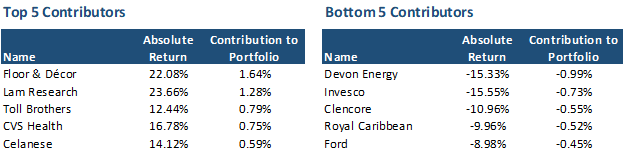 Energy continues to weight on the portfolio as 3 of our top 5 detractors are from the energy sector: Transocean, Grand Tierra, and ROAN Resources.