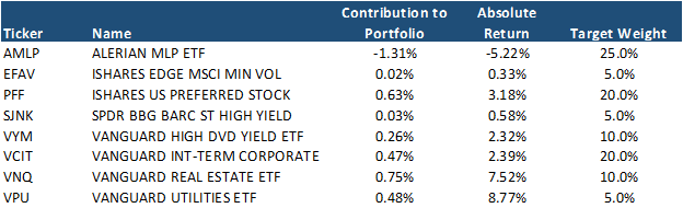 Once again, the underperformance in the DIAP relative to the 60/40 benchmark was primarily driven by weakness in MLP’s which produced a negative contribution to the portfolio’s return of -1.31% in the quarter. We continue to believe that MLP’s remain tremendously undervalued. Their value is depressed because the group continues to get lumped in with traditional energy stocks by most investors. As oil prices fell in Q3, MLP’s declined in tandem due to this misplaced view.