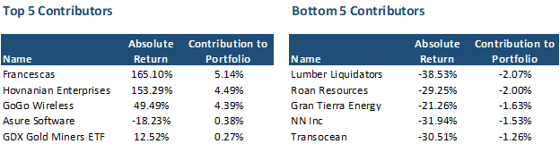 The increasing market volatility also led to our decision to raise cash. We sold the companies in our trading portfolio and emerging market stocks including Turkcell and Attento. We similarly sold Eagle Bulk Shipping, NN Inc, Intrepid Potash and Overseas Shipholding as these firms are more exposed to weakening global manufacturing data that has emerged over the last several months. We believed these companies were most at risk to seeing their recoveries stall. We will not be averse to rebuying these names if the non-US economic outlook improves.